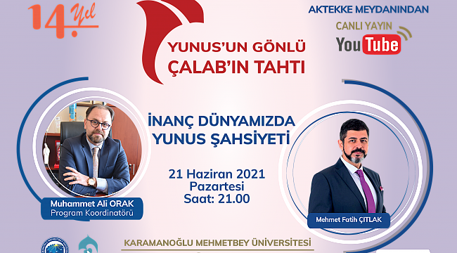 Karamanoğlu Mehmetbey Üniversitesi Rektörlüğü tarafından "2021 Yunus Emre ve Türkçe Yılı" kapsamında hazırlanan "Yunus’un Gönlü Çalab’ın Tahtı" adlı programın sekizinci hafta konuğu Mevlevi Postnişini Mehmet Fatih Çıtlak olacak.
