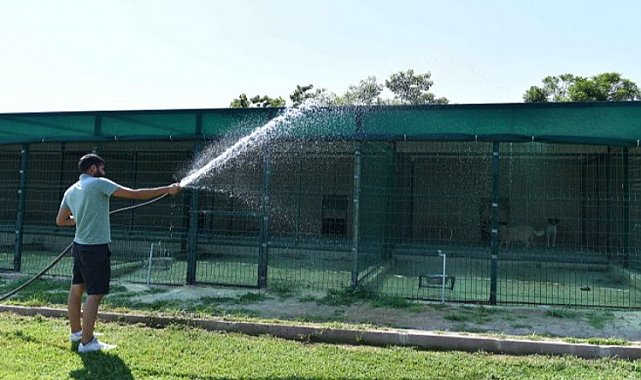Kavurucu yaz sıcaklıklarının etkili olduğu Antalya’da, Muratpaşa Belediyesi’nin Sokak Hayvanları Geçici Bakımevi ve Rehabilitasyon Merkezi’nde köpeklerin barınakları suyla serinletilirken kedilerin tutulduğu odalarda klimalar 24 saat çalışıyor.