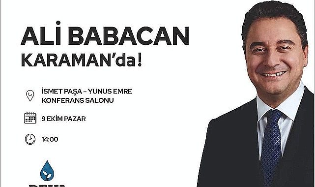 Deva Partisi Genel Başkanı Ali Babacan, 9 Ekim Pazar günü Karaman'a geliyor. DEVA Partisi Karaman il başkanı Mustafa Burak Demirer'den alınan bilgiye göre, Ali Babacan,