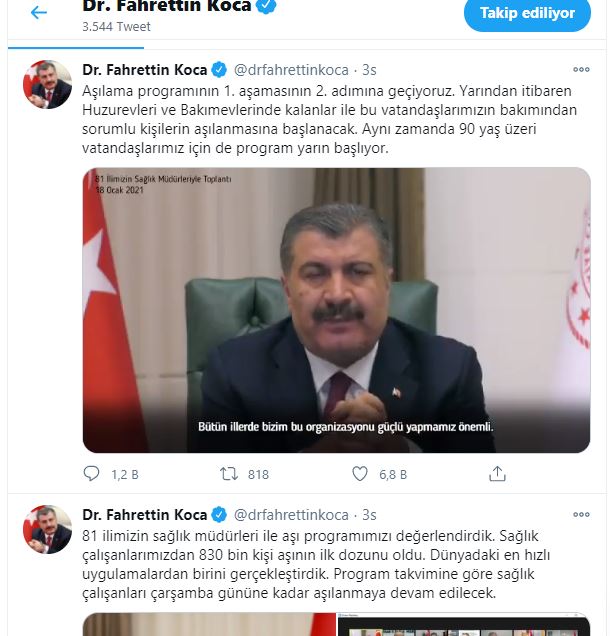 Bakan Koca, "90 yaş üstü vatandaşlarımızı sağlık kuruluşlarına getirmeden, aşılamalarını evinde, yerinde organize etmeyi istiyoruz" diye konuştu. "Dünyadaki en hızlı uygulamalardan birini gerçekleştirdik" diyen Koca, 830 bin sağlık çalışanına aşılama yapıldığımı açıkladı.