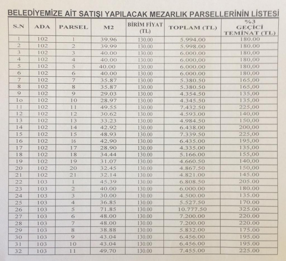 ''Vatandaşlarımızın talepleri doğrultusunda İlçemiz Seyran Mahallesi Fincan tepesi mevkiinde 109 ada 90 nolu parselde yapılan düzenleme sonucu ortaya çıkan mezarlık parsellerinin açık artırma ihale suretiyle satışa çıkarılmasına karar verilmiştir.Söz konusu mezarlık parsellerinin ada, parsel, satış fiyatı, m2 ve % 3 geçici teminatı aşağıdaki tabloda olduğu gibi tespit edilmiş olup, açık artırma satış ihalesi 16.07.2020 Perşembe günü saat 10:00’ da Belediye Encümen Toplantı Salonunda Encümen huzurunda sırasıyla yapılacaktır. Mezarlık parseli almak isteyen vatandaşlarımız buna ait şartnameler her gün mesai saatleri içinde Belediye Yazı İşleri Müdürlüğünden görülebilir.''