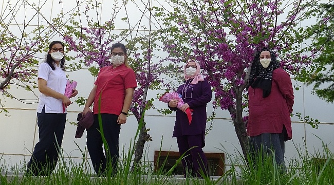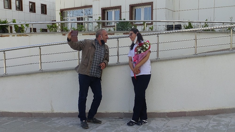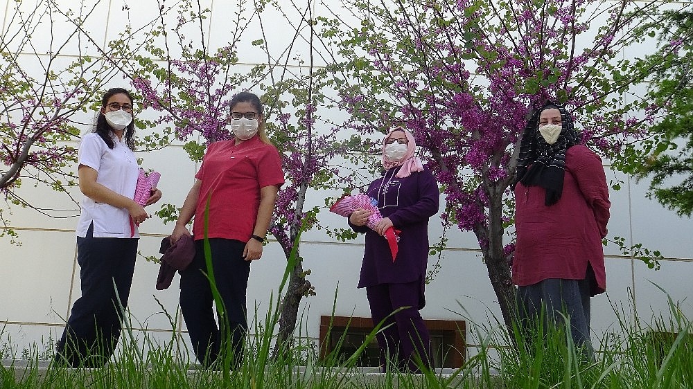 Karaman'ın ermenek ilçesi devlet hastanesinde çalışan hemşirelere eşleri çiçeklerle hastane bahçesinde sürpriz karşılama yaptı.