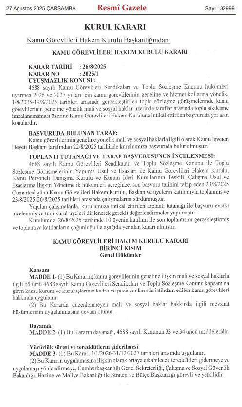 2026-2027 yıllarında memur ve emeklilerine uygulanacak mali, sosyal ve özlük haklarını içeren Kamu Görevlileri Hakem Kurulu kararı Resmi Gazete'de yayımlandı.