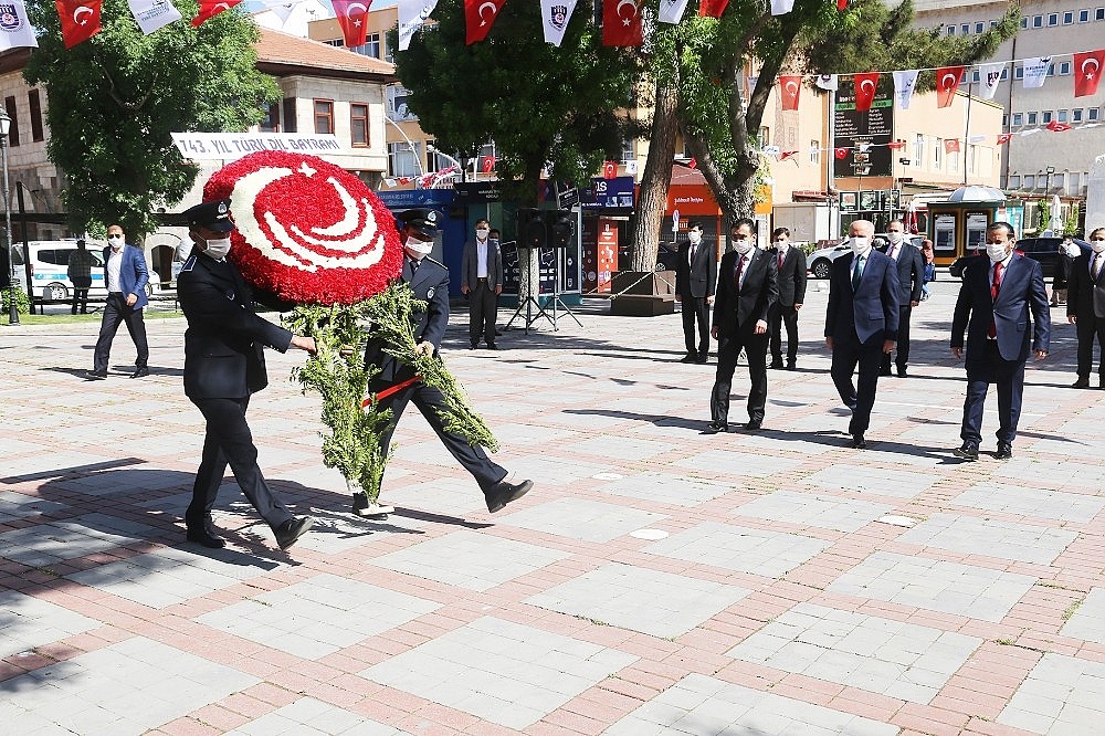Cumhuriyet Parkındaki Atatürk Anıtına çelenk bırakılmasıyla başlayan program saygı duruşunda bulunulması ve İstiklal Marşının okunmasıyla sona erdi. Korona virüs tedbirleri nedeniyle sosyal mesafeye uyularak gerçekleşen törene Karaman Valisi Fahri Meral, Belediye Başkanı Savaş Kalaycı ve Karamanoğlu Mehmetbey Üniversitesi (KMÜ) Rektörü Prof. Dr. Mehmet Akgül katıldı.