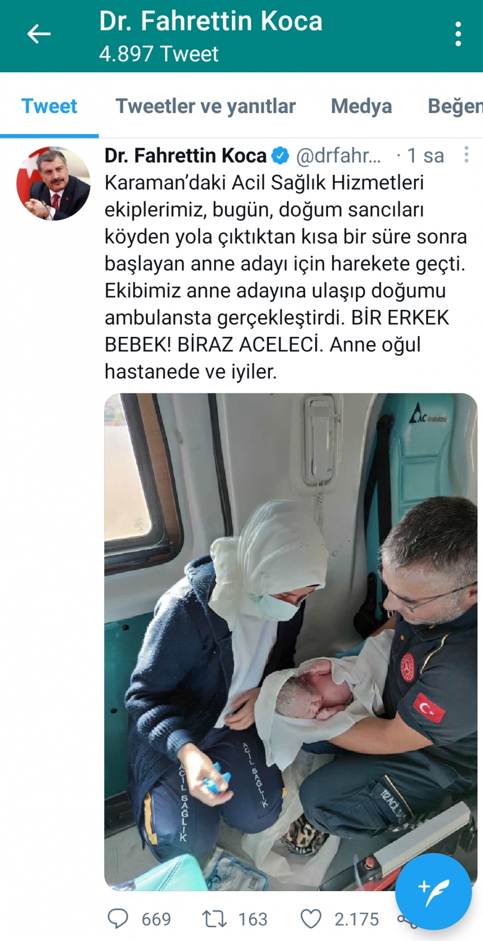 Karaman'da Ambulansda Doğan Aceleci bebeği Bakan Koca Twitter'dan paylaştı