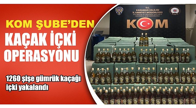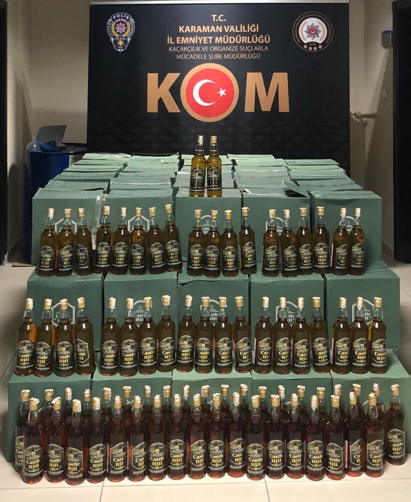 Karaman Emniyet Müdürlüğüne bağlı Kaçakçılık ve Organize Suçlarla Mücadele (KOM) Şube Müdürlüğünce 27.02.2020 günü yapılan bir çalışma neticesi A.Ç. isimli şahıstan toplam 1260 şişe gümrük kaçağı içki ele geçirildi.