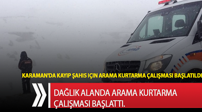 Edinilen bilgiye göre, Sarıveliler ilçesinde ikamet eden 51 yaşındaki Veli Altaş, pazar günü otomobiline binerek evinden ayrıldı. Veli Altaş'ın aradan geçen zamana karşı evine dönmemesi üzerine telaşlanan yakınları hemen jandarmaya giderek kayıp başvurusunda bulundu. İhbarın ardından yapılan aramalar sonuçsuz kalınca Karaman AFAD Müdürlüğünden yardım istendi. Bölgeye sabah saatlerinde ulaşan AFAD ekibi, Sarıveliler ve Başyayla ilçe jandarma ekipleriyle birlikte şahsın gitme ihtimali bulunan Sarıveliler ile Konya'nın Taşkent ilçesi arasındaki dağlık alanda arama kurtarma çalışması başlattı. Ekipler, tipi ve yoğun kar yağışı altında arama kurtarma çalışmasını sürdürürken, şuana kadar bir sonuç alınamadı.