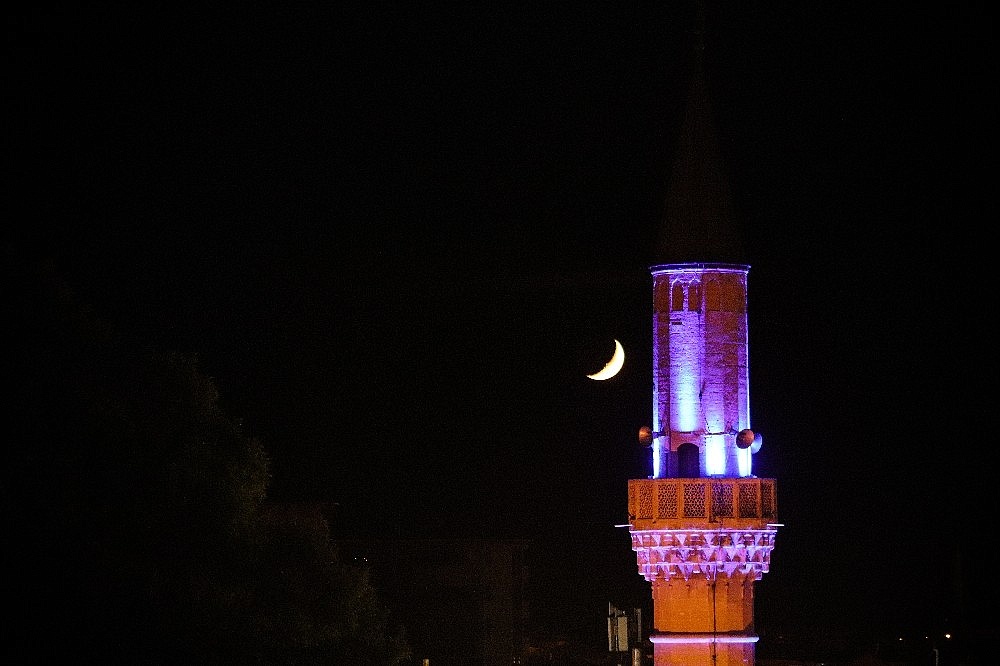 Karaman'da tarihi Aktekke Camisi'nin minaresi ile hilalin oluşturduğu manzara görenleri mest etti.