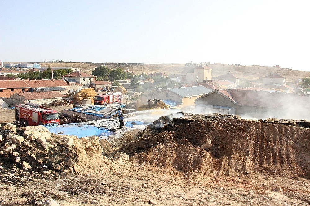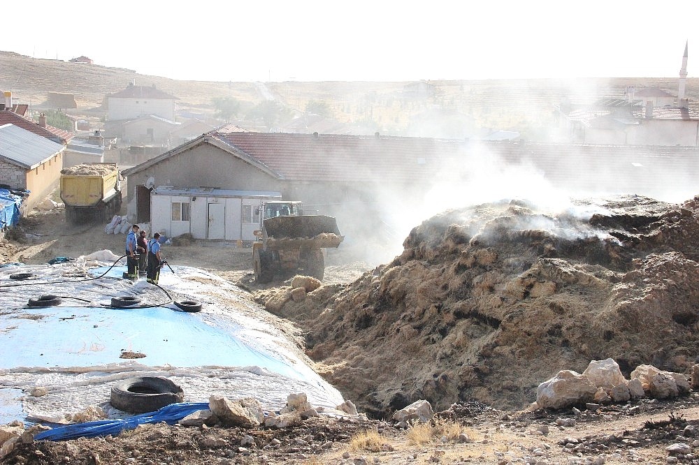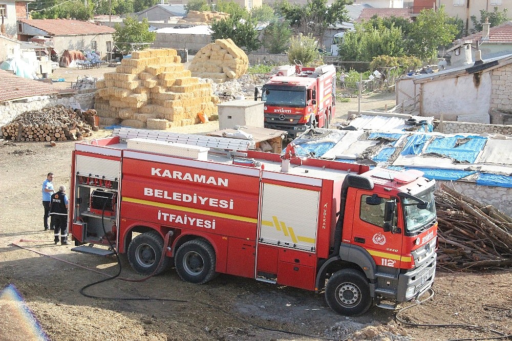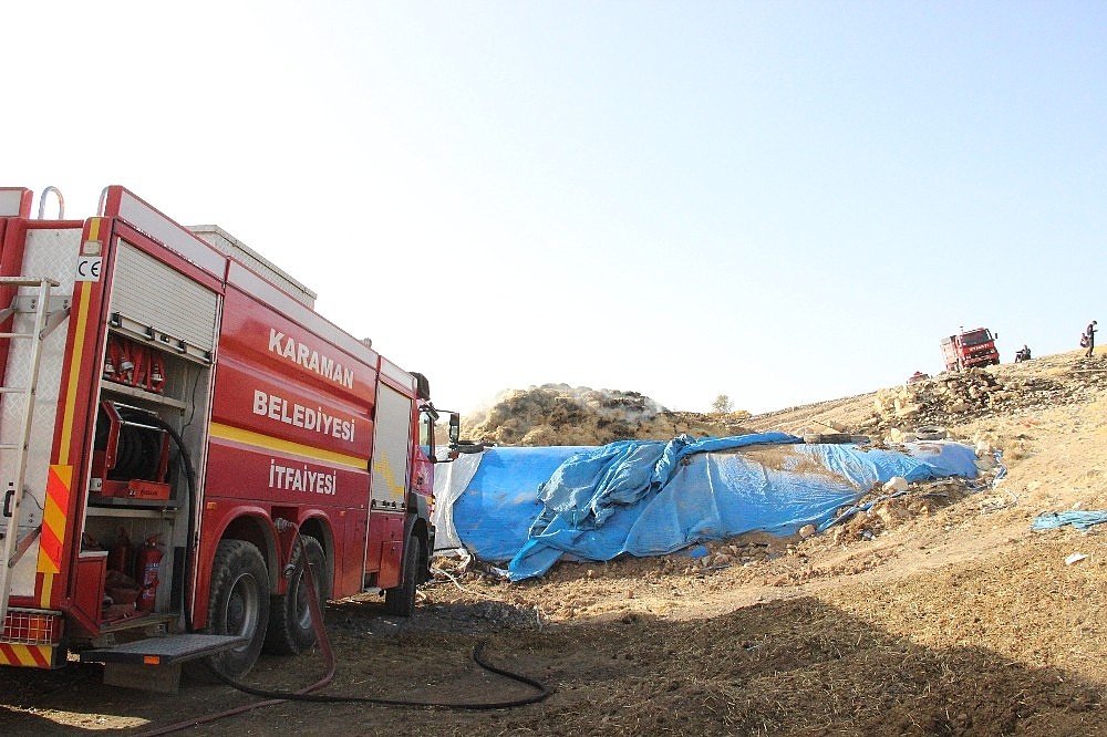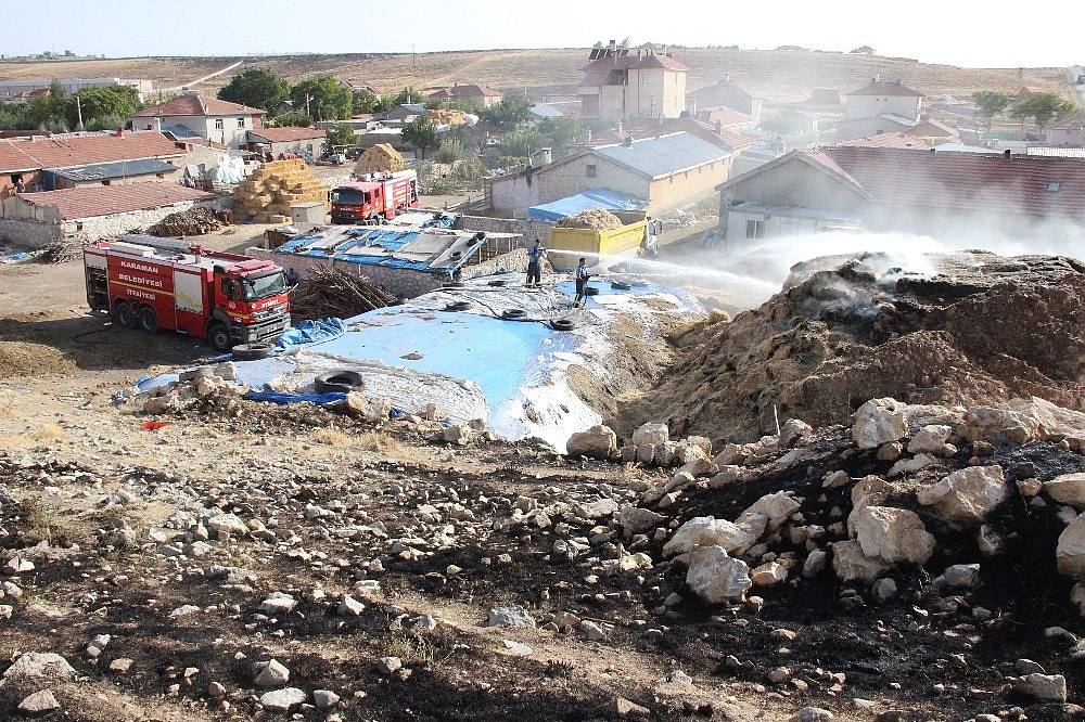 Karaman'da kuru otların tutuşması sonucu kıvılcımların saman balyalarına sıçraması sonucu çıkan yangın, itfaiye ekiplerinin uzun uğraşları sonucu söndürüldü.