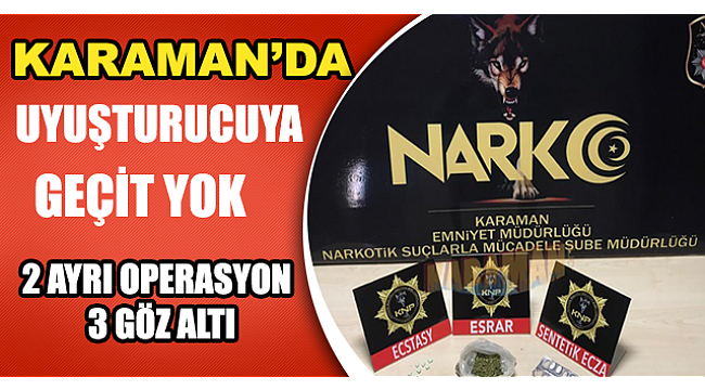 Uyuşturucu ve uyarıcı maddelerle mücadelesini kararlılıkla yürüten karaman Emniyet Müdürlüğü’ne bağlı narkotik Suçlarla Mücadale Şube Müdürlüğü timleri, Afgan uyruklu G.M.A isimli şahsın eroin, G.T ve D.T isimli şahısların uyuşturucu hap ve esrar maddesi sattığı yönünde aldığı ihbar sonrası çalışmalarına başladı.Yapılan çalışmalar sonucu şüphelilerin evlerine operasyon düzenleyen Narkotik timleri, 3 şahsı yakalayarak göz altına aldı.Göz altına alınan şahısların yapılan ev ve üst aramalarında, Afgan uyruklu G.M.A isimli şahsın evinde, 60 gram eroin, G.T ve D.T isimli şahısların yapılan ev ve üst aramalarında ise 36 gram esrar maddesi ve 9 adet uyuşturucu hap ele geçirildi.Ele geçirilen maddelere el konulurken, 3 şüpheli ifadeleri alınmak üzere Karaman Emniyet Müdürlüğü’ne götürüldü.Buradaki işlemleri tamamlanan şüpheliler sağlık kontrolünden geçirilerek adliyeye sevk edildi.