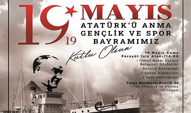 Yamaç Paraşütü İniş Alanında gündüz sahne gösterileriyle konserler gerçekleştirilecek, akşam fener ateşi ile Vosvos araçların ilçe turu etkinliklere renk katacak.Her yıl 19 Mayıs’ı düzenlediği etkinliklerle farkı kılan Talas Belediyesi, bu sene de birbirinden özel gösterilerle bayramı doyasıya yaşatacak.Etkinlikler kapsamında 19 Mayıs Cuma günü Yamaç Paraşütü İniş Alanı gün boyu birbirinden farklı gösterilere sahne olacak. Saygı duruşu ve İstiklal Marşı okunmasıyla başlayacak program, Atatürk’ü Samsun’a götüren Bandırma Vapurunun Kayseri Zincidereli Kaptanı İsmail Hakkı Durusu için hazırlanan belgesel gösterimiyle devam edecek. Birbirinden özel sahne gösterilerinin yer alacağı programda ayrıca Ahsen-Aksel ikilisi ile Ozi Sanat Okulu muhteşem bir konser verecek. Bunların yanı sıra Talas Belediyesi Sporcu Okulu ile Talas İlçe Gençlik ve Spor Müdürlüğünün badminton, okçuluk, cimnastik, masa tenisi, basketbol oyunları da programı renklendirecek.Kutlamaların akşam bölümünde ise Talas Belediyesi önünde fener ateşi yakılacak. Talas Belediye Başkanı Mustafa Yalçın, üstü açık gezi otobüsüyle ilçe turuna çıkarak marşlar ve şarkılar eşliğinde vatandaşların bayramını kutlayacak. Bu konvoya Vosvos araçlar da eşlik ederek kutlamalara renk katacak.