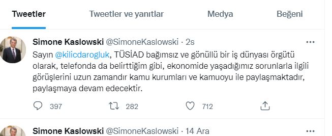 Twitter hesabından açıklama yapan TÜSİAD Başkanı, "Ekonomide yaşadığımız sorunlarla ilgili görüşlerini uzun zamandır kamu kurumları ve kamuoyu ile paylaşmaktadır, paylaşmaya devam edecektir" ifadelerini kullandı.