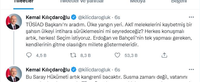 "TÜSİAD BAŞKANI'NI ARADAIM"TÜSİAD Başkanı Simone Kaslowski'yi aradığını açıklayan Kılıçdaroğlu; "Ülke yangın yeri. Aklî melekelerini kaybetmiş bir şahsın ülkeyi intihara sürüklemesini mi seyredeceğiz? Herkes konuşmalı artık, herkes! Seçim istiyoruz. Erdoğan ve Bahçeli’nin tek yapması gereken, kendilerinin gitme olasılığını millete göstermeleridir." ifadelerini kullandı.Kılıçdaroğlu paylaşımında şunları söyledi:"Bu Saray Hükümeti artık kangrenli bacaktır. Susma zamanı değil, vatanını seven herkes konuşmalı. Tüm vücut kangren olduktan sonra, konuşsanız da bir anlamı olmayacak. Utancı giden kimsenin kalbi ölürmüş. Bu Saray ve şürekasının utanması yoktur, kalbi yoktur. Bu zulmü bitireceğiz!"