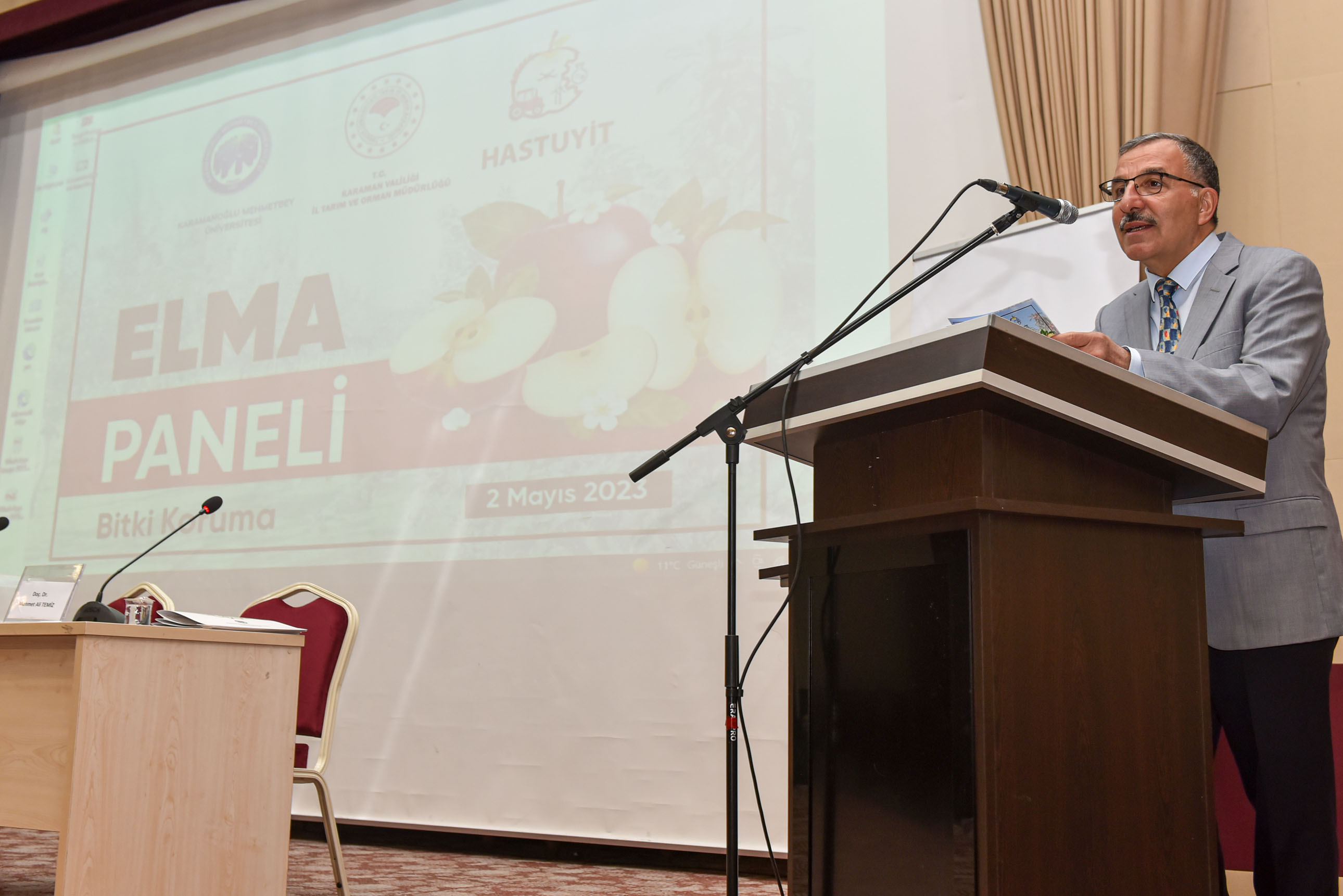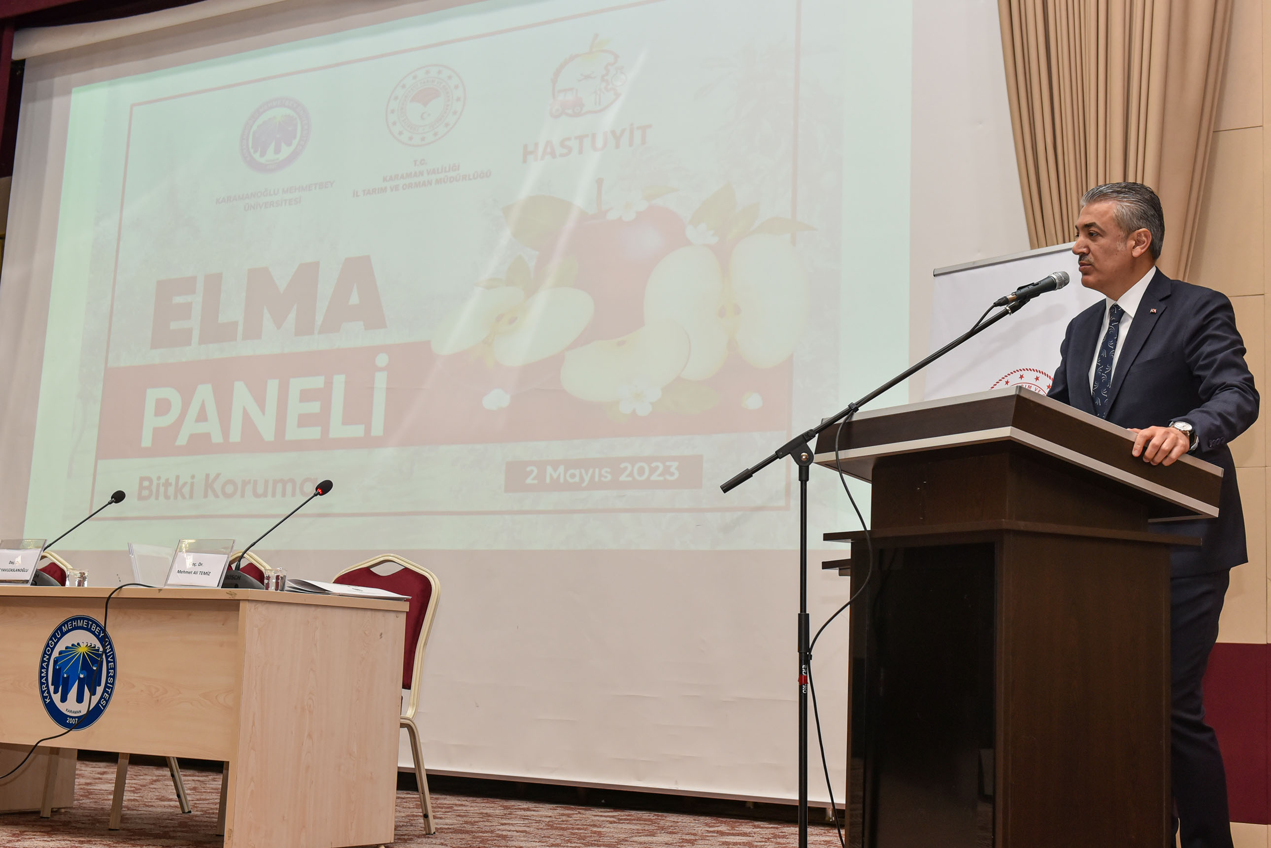 İlki bitki koruma hakkında gerçekleştirilen elma panelinin 2’ncisi sulama, 3’üncüsü bitki besleme ve 4’üncüsü yetiştiricilik olmak üzere bir seri halinde devam edeceğini belirten Rektör Prof. Dr. Mehmet Gavgalı ise, “Ülkemizde yaklaşık 1 milyon 750 bin dekar alanda, 3 milyon 500 bin ton elma üretilmektedir. Bu üretimin yaklaşık yüzde 30’u Karaman, Niğde ve Konya illerinde gerçekleşmektedir. Üretim miktarı yönünden dünyada Çin ve ABD’den sonra üçüncü sırada olan Türkiye, üretiminin yüzde 7’sini ihracat etmektedir. İhracatta yaklaşık 260 bin ton ile dünyada 10’uncu sırada yer almaktadır. Ülkemiz üretimde 3’üncü sırada yer alırken ihracatta 10’uncu sıraya düşmesinin temel sorunları arasında ‘üretim ve pazarlamadan’ kaynaklanan sorunlar yer almaktadır.” dedi.