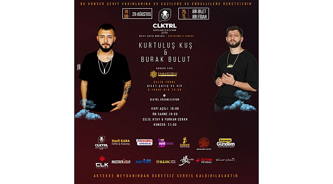 Son zamanlarda müzik sektörünün parlayan yıldızları Kurtuluş Kuş ve Burak Bulut Karaman’da ilk konserine çıkıyor. Karaman'ın şirketi CLKTRL ORGANİZASYON adı ile Çelik Türül tarafından düzenlenen açık hava konserinde satılan her bilet için ise bir fidan bağışı yapılacak.