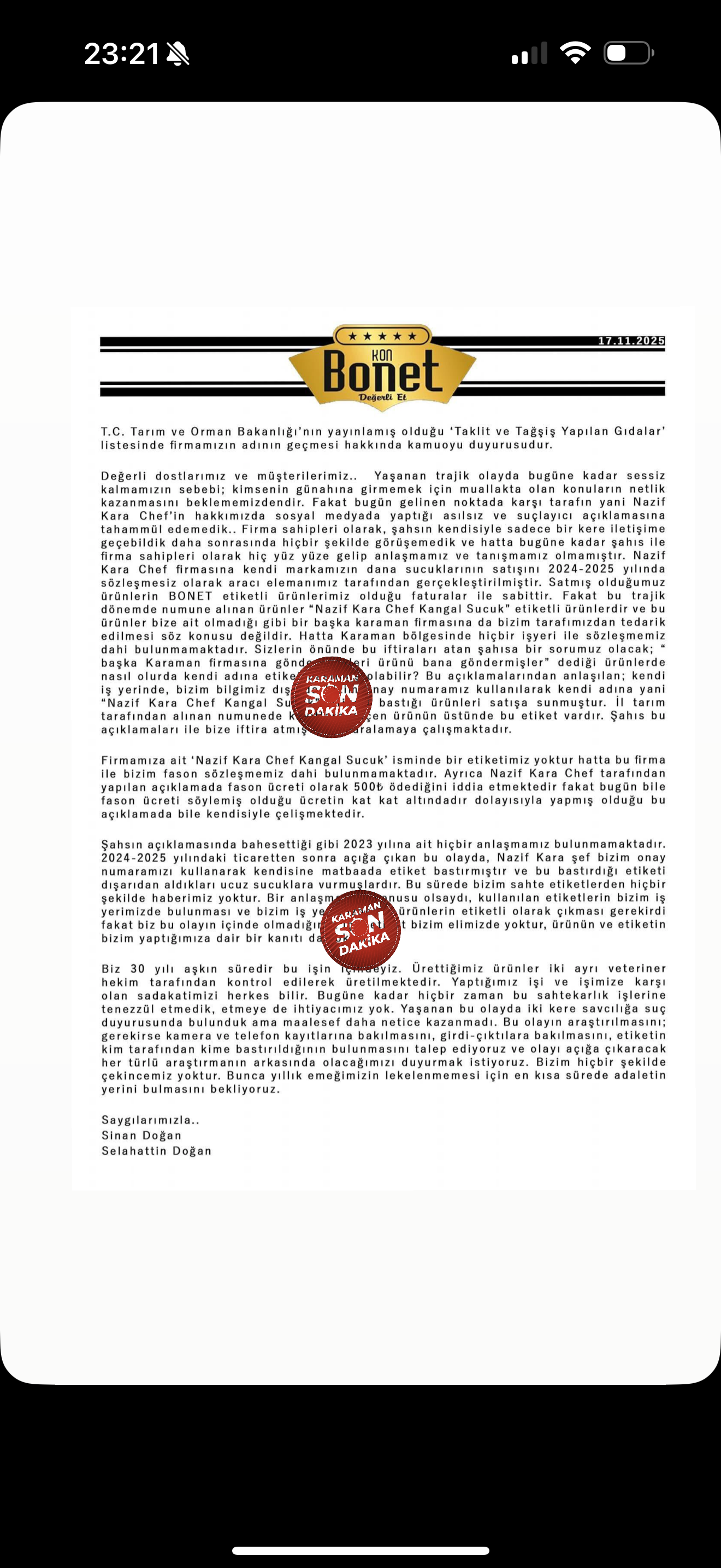 Karaman’da T.C. Tarım ve Orman Bakanlığı’nın yayımladığı “Taklit ve Tağşiş Yapılan Gıdalar” listesinde isimlerinin yer alması üzerine açıklama yapan firma sahipleri Sinan Doğan ve Selahattin Doğan, iddiaları kesin bir dille yalanladı. Firma sahibi Sinan Doğan ile yaptığımız görüşmede, kamuoyuna sunulan açıklamanın kendilerine ait olduğunu doğruladı.Firma yetkilileri, Tarım Bakanlığı listesinin ardından sessiz kalmalarının sebebinin “olayın netleşmesini beklemek” olduğunu ancak Nazif Kara Chef’in sosyal medya üzerinden yaptığı suçlayıcı paylaşımlar nedeniyle açıklama yapmak zorunda kaldıklarını belirtti.