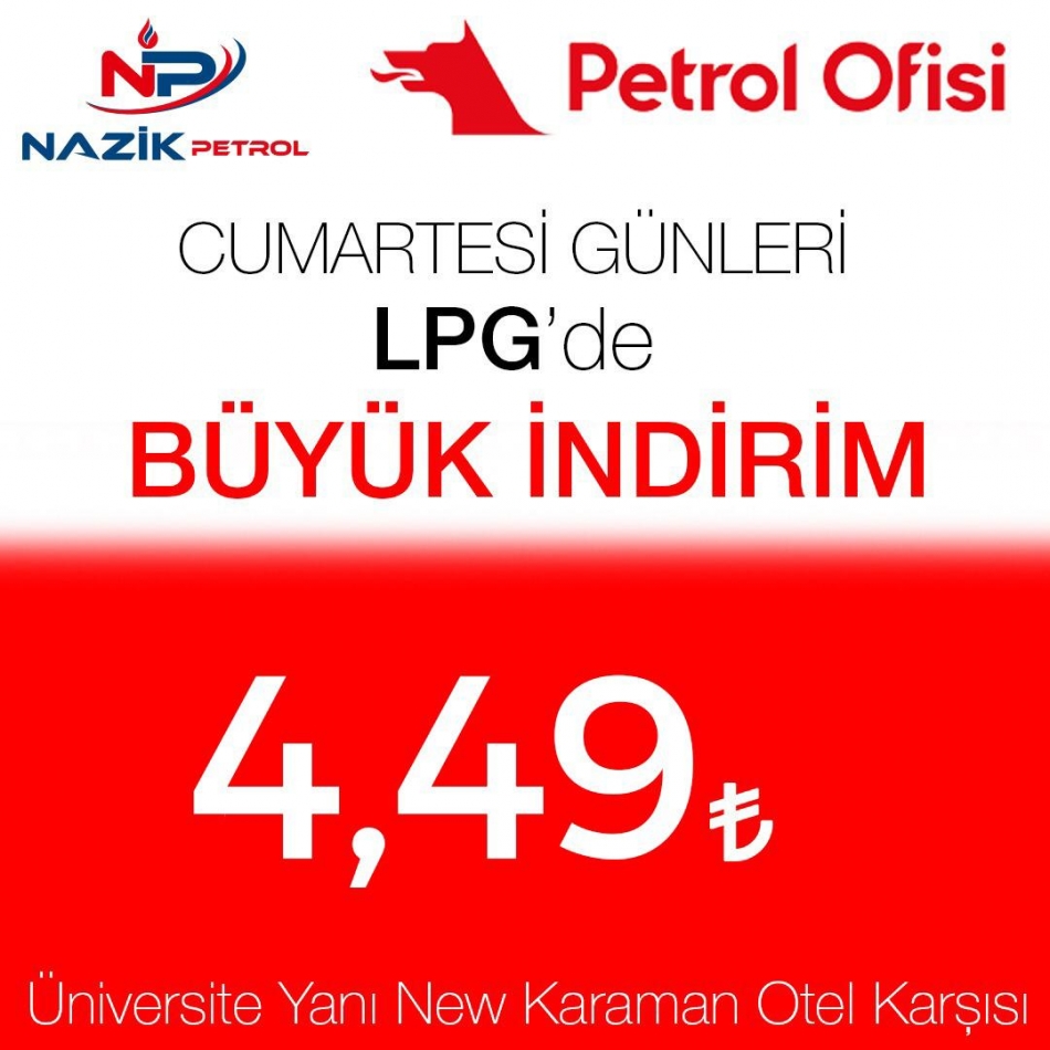 Taptuk Emre Mahallesi İbrahim Öktem Caddesi GİM Toptancılar sitesinde bulunan Nazik Petrol, Cumartesi günleri için başlattığı LPG’de indirim kampanyasıyla da Karaman halkının gözdesi haline geldi. Büyük indirim kampanyası 4,49 TL olarak belirlendi.