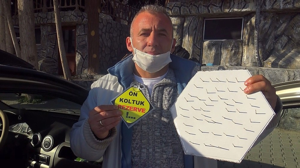 49 yaşındaki Ömer Battır, hemşire olan eşini yıllardır işe götürüp getirdiği için, eşinin ön koltuğa alıştığını ve bu alışkanlığından zor vazgeçtiğini ifade etti. Otomobiline binmek isteyenlerin korona virüs salgını nedeniyle sosyal mesafe kuralı gereği arka koltuğa oturmasını istediğini ancak bazen ön koltuğa oturmak için ısrar edenler olduğunu anlatan Ömer Battır, "Korona virüs bu günlerde başımızın belası oldu. Bizim de evde çok fazla boş vaktimiz var, sıkılıyoruz. Kendimize tedbirler uydurma peşindeyiz. Sağ ön koltuk mevzu çıktığında da evde aklıma bir fikir geldi. Ben de onu hayata geçirdim, şu şekilde bir tahta ile üstüne çiviler çakarak ön sağ koltuğu kendi tedbirlerimle boş tutmaya çalışıyorum. Ön koltuk rezerve yazılı bir yazı da hazırladım ve böylelikle sağ ön koltuğu boş tutmaya çalışıyorum. Eşim yıllardır ön koltuğa oturuyor. Arka koltuğa alışkın değil, o biraz zorlandı. Bu tahtayı eşim için uygulamadım tabi. Arka koltuğa alışmaya başladı. Ön koltuğa oturmaya teşebbüs edenler oluyor ama çivili tahtamızı görünce vazgeçiyorlar, canları yanacağını bildikleri için" dedi.