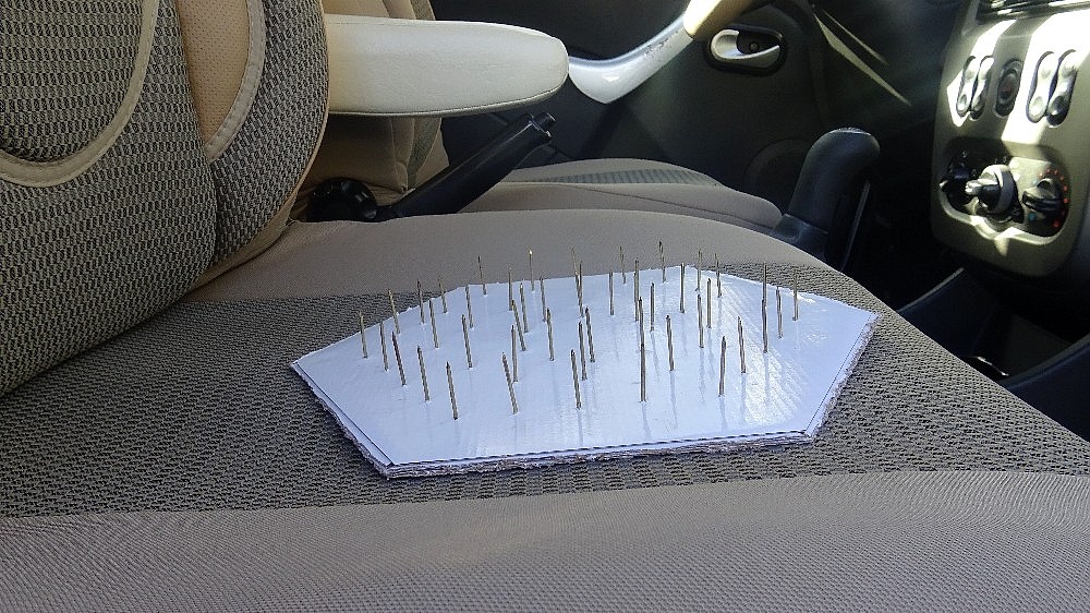 Karaman'ın Ermenek ilçesinde, hazırladığı çivili tahtayı aracının ön koltuğuna kimse oturmasın diye yerleştiren kişi, görenlerin ilgisini çeken tahtaya 'korona savar' adını verdi.