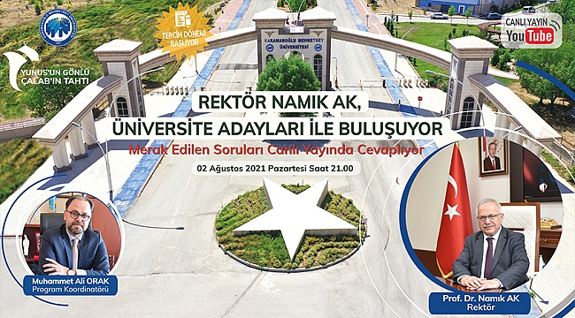 Karamanoğlu Mehmetbey Üniversitesi Rektörü Prof. Dr. Namık Ak, KMUTV youtube kanalı üzerinden canlı yayında öğrencilere seslenecek. Karamanoğlu Mehmetbey Üniversitesi Rektörü Prof. Dr. Namık Ak, online olarak canlı yayında KMUTV Youtube kanalında üniversite adayları ile bir araya gelerek onların sorularını cevaplayacak.