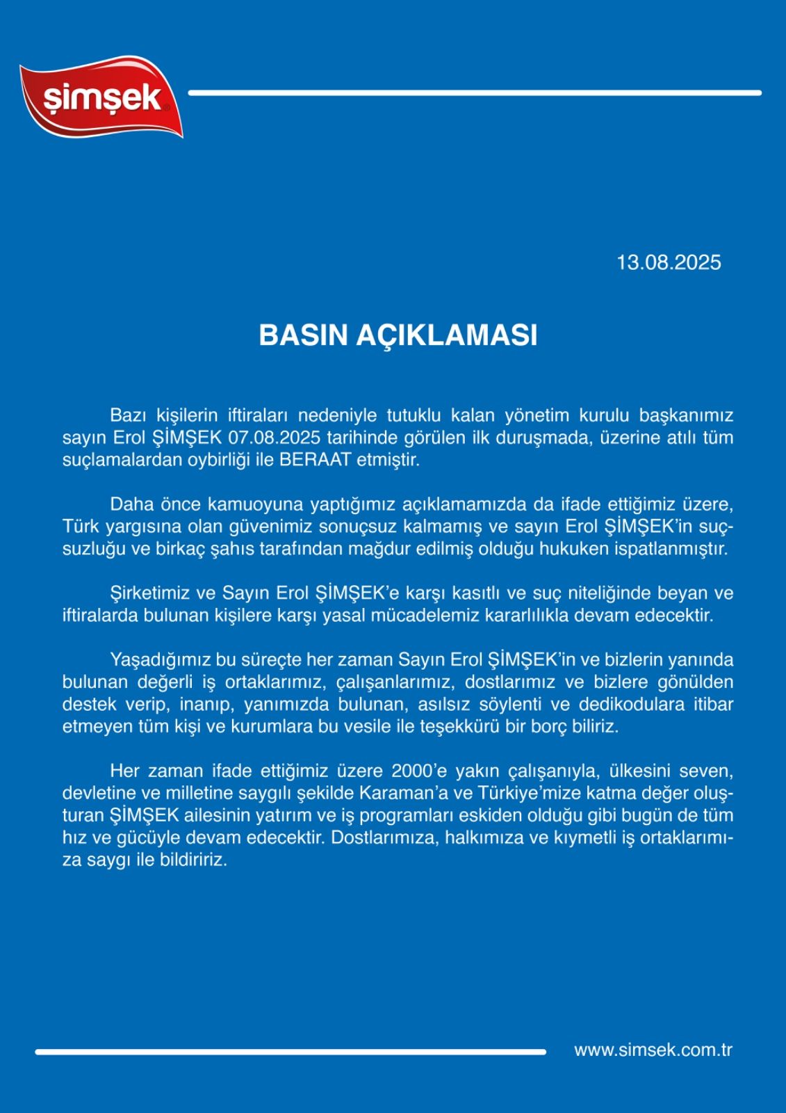 Şimşek Gıda A.Ş. açıklamasında, daha önce kamuoyuna yansıttıkları “Türk yargısına olan güven” ifadelerinin boşa çıkmadığını, Erol Şimşek’in suçsuzluğunun hukuken ispatlandığını vurguladı. Ayrıca, kasıtlı ve suç teşkil eden beyanlarda bulunarak iftirada bulunan kişiler hakkında yasal mücadelenin kararlılıkla sürdürüleceği belirtildi.