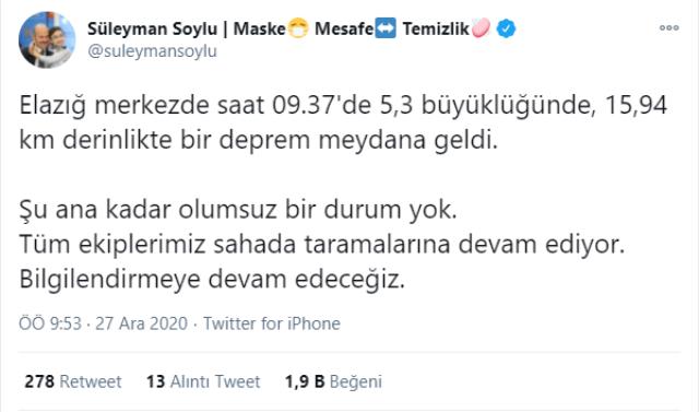 Elazığ’da 5.3 büyüklüğünde deprem meydana geldi. Depremle ilgili açıklama yapan İçişleri Bakanı Süleyman Soylu, "Şu ana kadar olumsuz bir durum yok. Tüm ekiplerimiz sahada taramalarına devam ediyor" dedi.